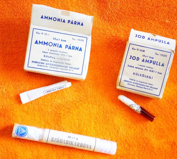 retró egészségügyi cikkek, elsősegély doboz tartalma: ammónia párna, jód ampulla, steril mintavevő készlet