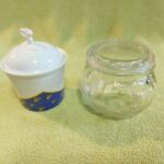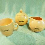 Eladó díszként használt hasas bögre, aranyozott szegéllyel és levélmintás díszítéssel. 9cm magas.