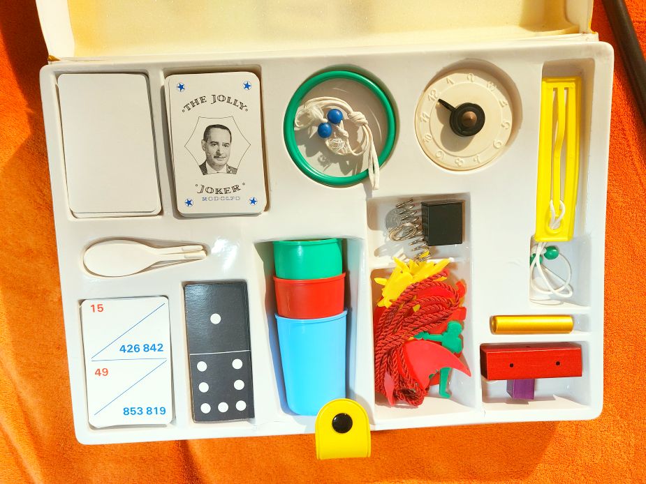 - Komplett Illúziócsomag: A táska eredetileg 55 különböző mutatvány elvégzéséhez szükséges kellékeket tartalmazott, a kártyatrükköktől kezdve az ördöglakatokon át a bűvészpálcáig.