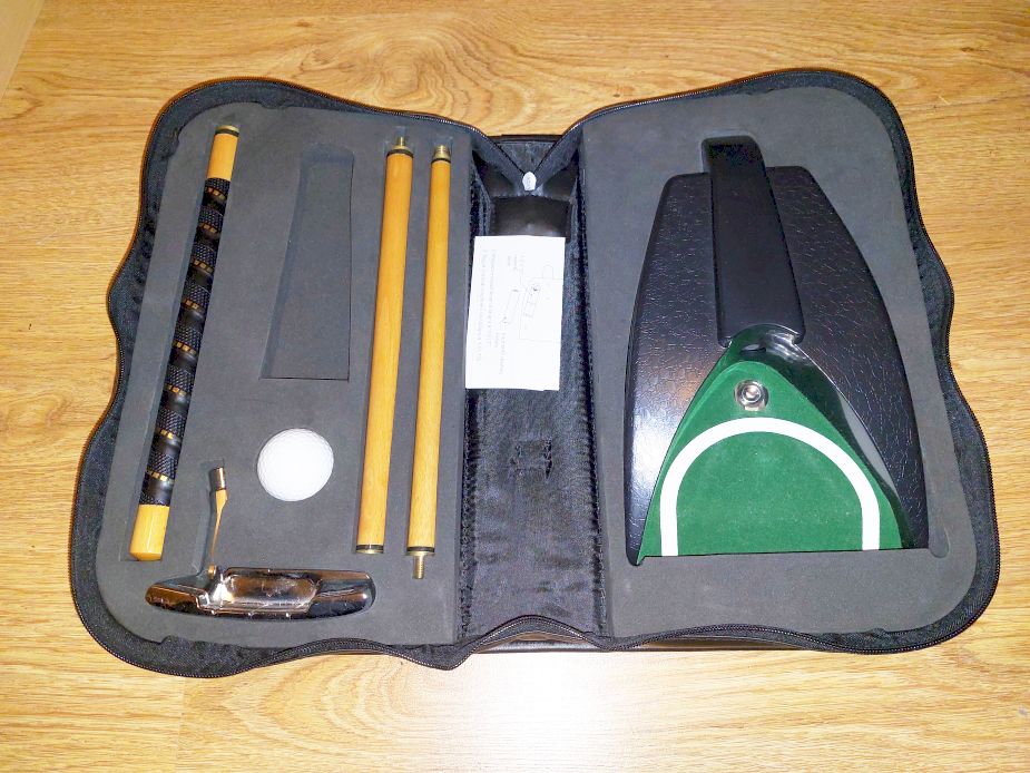 Tartalma: összecsavarozható golf ütő, két golflabda, lyukat imitáló fakeret valamint elegáns tartótok.